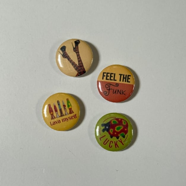 Bring the groove wherever you go with this bold and colorful button pin set. Each pin measures 1 inch in diameter and features fun, funky designs that radiate personality. Perfect for adding a retro flair to jackets, bags, or your favorite accessories.