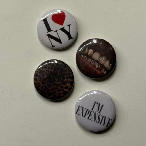 This 4-pin set brings bling and patterns to any outfit. Each 1-inch button is designed, hand-printed, and pressed by me, making them unique pieces of wearable art.