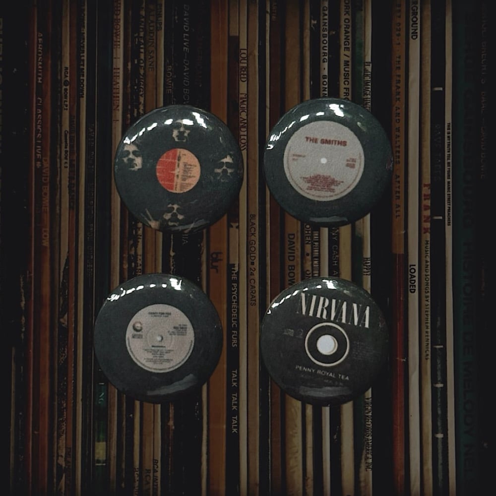 Bring classic music icons to your outfit with this 4-pin set. Each 1-inch button is designed, hand-printed, and pressed by me.